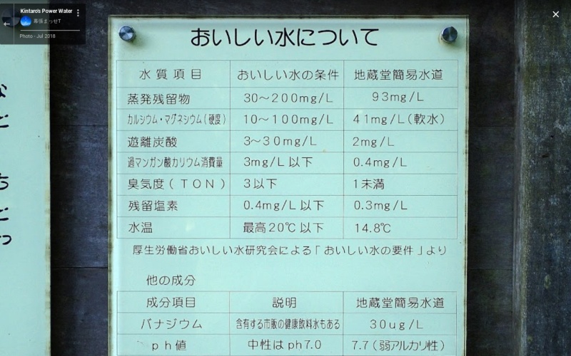 天然のミネラルとして注目を浴びているバナジウムを1リットル当り30μg含み、血糖値を下げ、脂質・コレステロールの代謝を促し、中性脂肪を正常に保つなどの働きがあり、動脈硬化を防ぐとされている。 源頼光(平安時代中期の武将)の四天王の一人である坂田金時(幼名 金太郎)は、地蔵堂で生まれ、夕日の滝の水を産湯を使ったという伝説があり、下流には金太郎が遊んだという「遊び石」もある。 金太郎は地蔵堂の四万長者といわれたお金持ちの娘の子として生まれたとされ、銭洗いをする人々もいる。 |