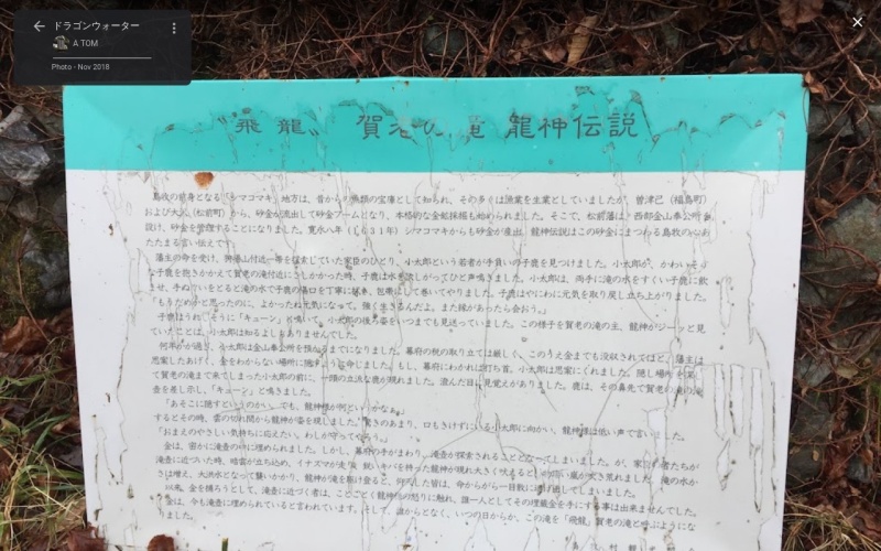 | [言い伝え・概要] | 賀老高原一帯は、日本一の広さを誇るブナ原生林など大自然に囲まれている秘境で、龍神伝説がある賀老の滝(高さ70m幅35m)北部にある湧水は「ドラゴンウォーター」と呼ばれ、岩の割れ目から鉄分を含んだ濃度の濃い炭酸水が湧き出ている。