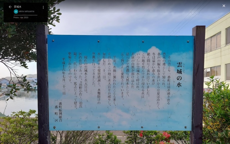 【雲城水】(福井県の湧水)(平成の名水百選)小浜市一番町 若狭の自然が溶け込んだ 清らかで芳醇な天然水 [湧水の名称] 雲城水(うんじょうすい) [場所] 福井県小浜市一番町 [言い伝え・概要] 海のすぐそばにありながら、海水の混入が無く、淡水が自噴している。 「ふくいのおいしい水」「平成の名水百選」 [保全活動] 一番町振興会により、環境保全活動が行われており、湧水を使用した日本酒やお菓子を販売する等、活用も行っている。 [Google クチコミ] こちら 出典 環境省ホームページ お気に入りに追加※自然の湧水は煮沸して飲用されるとより安全です。※水辺は水難や危険生物に十分気を付けてください。 Click to share on X (新しいウィンドウで開きます) X このエントリーをLINEで送る (新しいウィンドウで開きます) LINEに送る Facebook で共有するにはクリックしてください (新しいウィンドウで開きます) Facebook このエントリーをはてなブックマークに追加 (新しいウィンドウで開きます) はてなブックマーク (名水・名勝)平成の名水百選 中部 | 福井県 | 小浜市 投稿日: 2021年3月13日2023年6月19日 投稿者: Sumai事務局