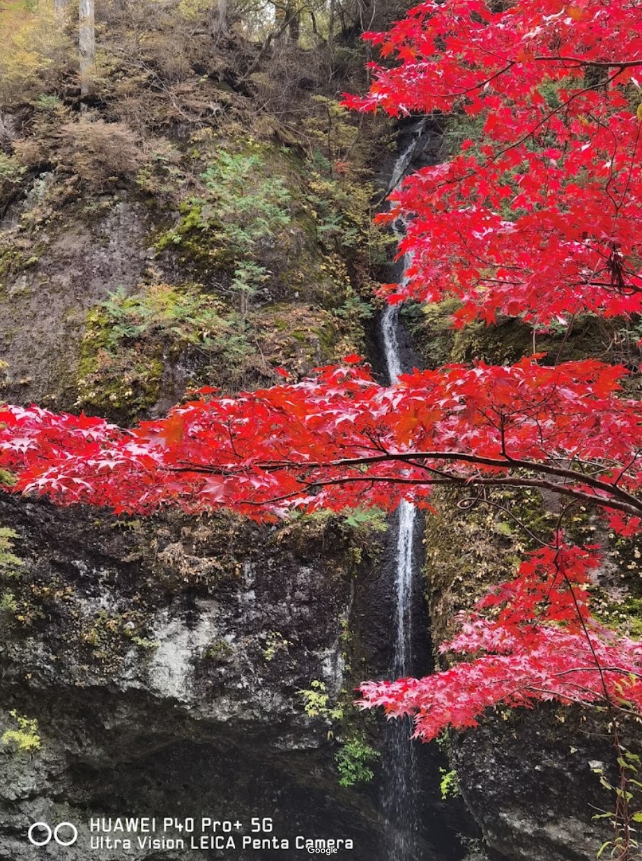 御神酒をいれる瓶子(みすず)のような形をした奇岩の間から滝が流れ落ちていることから「瓶子の滝」と呼ばれ、流れる様が繊細で清らかな滝として知られる。 厳しい冬になると滝が凍って氷柱が立つこともあり、珍しい風景に足を止める人々も多い。 |