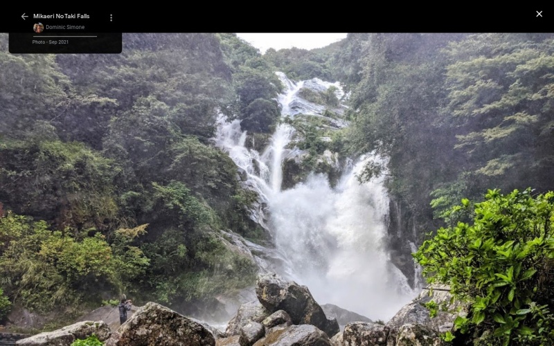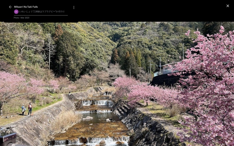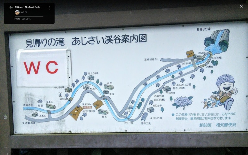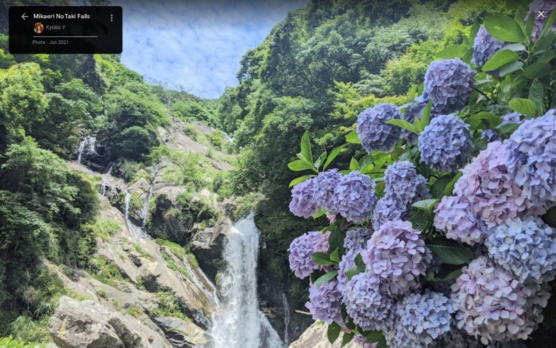 坂道を登って滝を見て帰ろうとしても、また戻ってでも見たいと思わせる滝として「見帰りの滝」と名付けられたという。 滝の下流の伊岐佐川は、春は濃いピンク色の河津桜、初夏は色とりどりの紫陽花が咲き誇る名所として観光で賑わい、駐車場も多数整備されている。 |