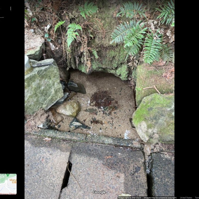 木の付け根と側溝の間に石で囲った水場があり、清らかな水が湧き出ている。