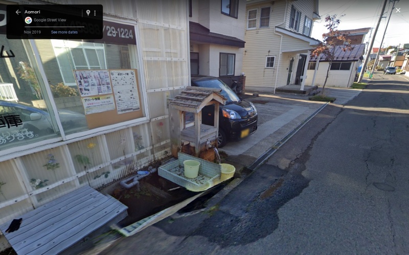 【大湊天然水 和戸の水】(青森県の水汲み場)むつ市川守町 海沿い住宅街の通り沿いで二方向に湧き出る水汲み場