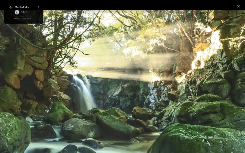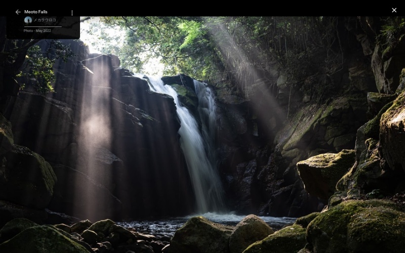 左側が男滝(落差15m)、右側が女滝(落差12m)として夫婦滝と呼ばれ、縁結びの滝として有名で訪れる人々も多い。 娘が身を投げたのが女滝、侍が吸い込まれたのが男滝という伝説が残されている。 早朝には幻想的な光が差し込み、滝に注ぐ光のカーテンを見ることができる。 熊本県名水百選に認定。 |