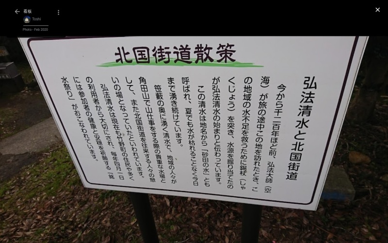 【弘法清水】(新潟県の湧水)新潟市西蒲区竹野町 万病に効くという弘法大師ゆかりの霊水 [湧水の名称] 弘法清水(こうぼうしみず) [場所] 新潟県新潟市西蒲区竹野町 [言い伝え・概要] 弘法大師が立ち寄り,良民の快い施しを受けたお礼にと,手にしていた錫杖を土に刺し,これを抜くと水が湧き出て窮状を救ったと伝えられる。 立入可。 [保全活動] 年1回水質の調査を行っている。 [Google クチコミ] こちら 出典 環境省ホームページ お気に入りに追加※自然の湧水は煮沸して飲用されるとより安全です。※水辺は水難や危険生物に十分気を付けてください。 Click to share on X (新しいウィンドウで開きます) X このエントリーをLINEで送る (新しいウィンドウで開きます) LINEに送る Facebook で共有するにはクリックしてください (新しいウィンドウで開きます) Facebook このエントリーをはてなブックマークに追加 (新しいウィンドウで開きます) はてなブックマーク (効能別)万病に効く | (人物)弘法大師 新潟県 | 中部 | 新潟市 投稿日: 2021年3月14日2023年6月20日 投稿者: Sumai事務局