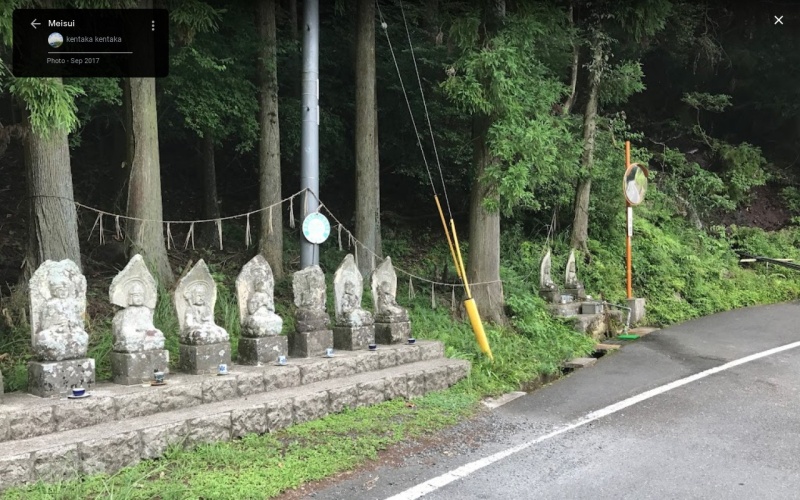 取水できるパイプの横では、岩肌を伝うように水が流れ出ている。 水神様の石仏群が目印で、車を横付けできるスペースがある。 |