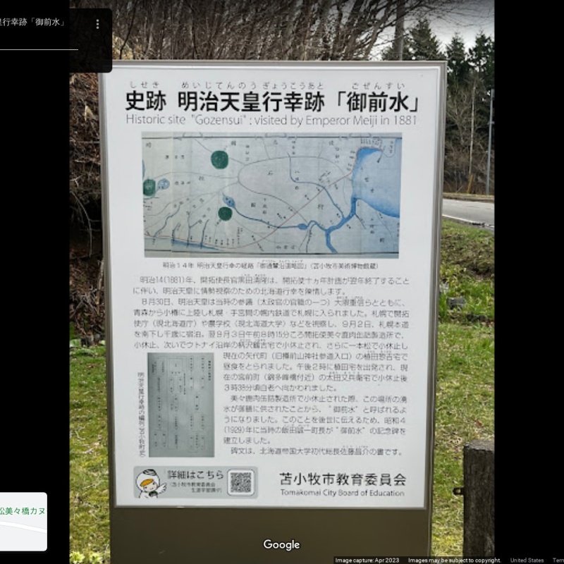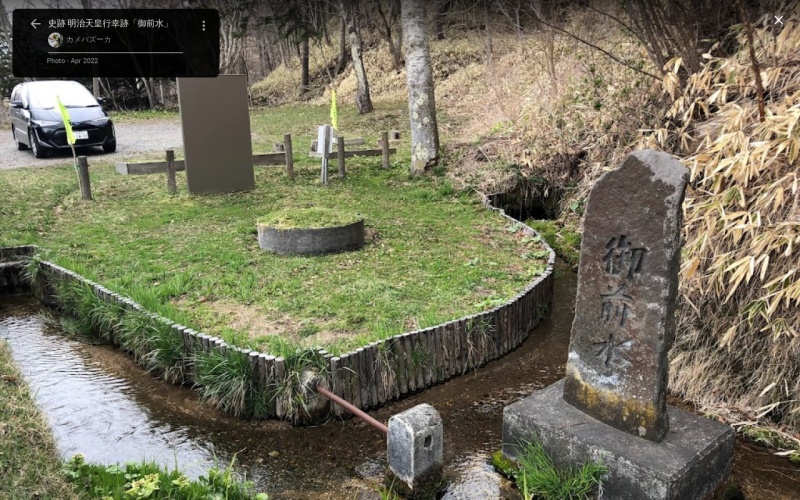 【明治天皇 行幸跡「御前水」】(北海道の湧水)苫小牧市美沢 明治初期の開拓で明治天皇の御膳に捧げられた湧水 [名称] 明治天皇 行幸跡「御前水」 [場所] 北海道苫小牧市美沢 [言い伝え・概要] 明治14年(1881年)、開拓使十ヵ年計画の終了間近になったことで長官黒田清隆に招かれた明治天皇が行幸の際、この場所の湧水が御膳に供された事から「御前水」と呼ばれるようになった。 泉の中には昭和4年に建てられた石碑があり、飲用に適していないので飲まないよう看板が立っている。 [保全活動] [Google クチコミ] こちら お気に入りに追加※自然の湧水は煮沸して飲用されるとより安全です。※水辺は水難や危険生物に十分気を付けてください。 Click to share on X (新しいウィンドウで開きます) X このエントリーをLINEで送る (新しいウィンドウで開きます) LINEに送る Facebook で共有するにはクリックしてください (新しいウィンドウで開きます) Facebook このエントリーをはてなブックマークに追加 (新しいウィンドウで開きます) はてなブックマーク (人物)明治天皇 北海道 | 苫小牧市 投稿日: 2023年5月4日 投稿者: Sumai事務局