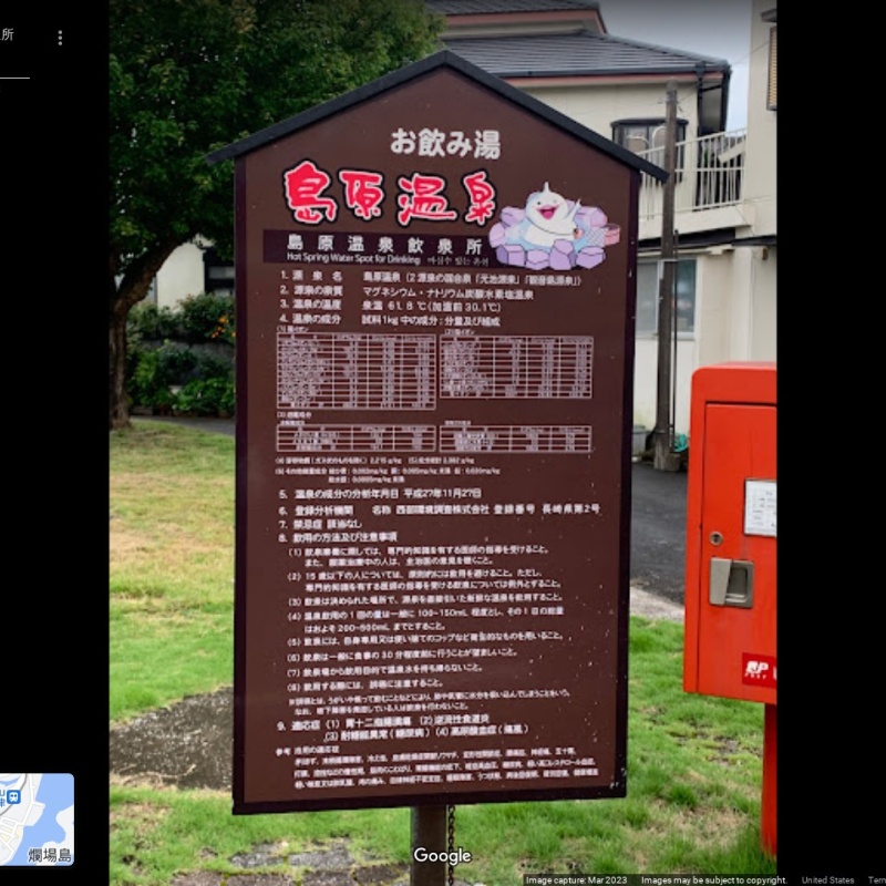 | [言い伝え・概要] | 国道251線沿いの湊広場場緑地のバス停隣にある、島原温泉の無料水飲み場。