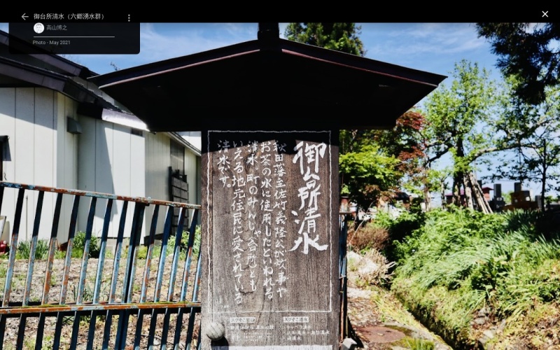 | [言い伝え・概要] | 菅江真澄の紀行文「月の出羽路」の絵詞に「瓠(ふくべ)清水即御台所清水也」とあり、本来は形がひさご(ふくべ)に似ているのでふくべ清水であるが、台所清水というわけは「むかし此地に鑑照公(佐竹藩21代、久保田2代藩主佐竹義隆)の御憩在りし御館の蹟なれば・・・」とある。 真澄によると「御憩館のみかしぎ(お炊事)料に汲み、御茶の水にもめし給ひしよし也」と台所の解釈をしている。 |