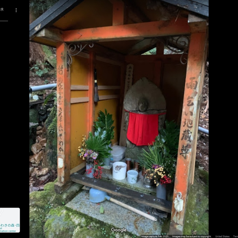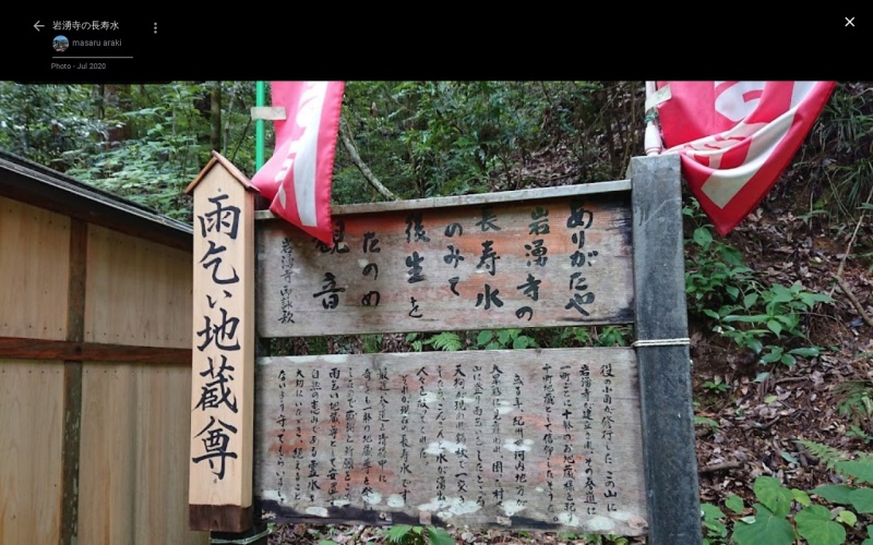 【岩湧寺の長寿水】(大阪府の湧水)河内長野市加賀田 昔、天狗が大旱魃の時に人々を救ったという 雨乞い地蔵尊の有難い水 [名称] 岩湧寺の長寿水 [場所] 大阪府河内長野市加賀田3822 [言い伝え・概要] 或る年、紀州や河内地方が大干ばつに見舞われ、困った村人たちが山に登り雨乞いをしたところ、天狗が現れ錫杖で一突きしたら、こんこんと水が湧出して人々を救ってくれたという。 それが現在の長寿水で、最近参道を清掃中に奇しくも一体の地蔵尊を発見し、感謝と祈願をこめて雨乞い地蔵尊として安置している。 (現地掲示板より) [保全活動] [Google クチコミ] こちら お気に入りに追加※自然の湧水は煮沸して飲用されるとより安全です。※水辺は水難や危険生物に十分気を付けてください。 Click to share on X (新しいウィンドウで開きます) X このエントリーをLINEで送る (新しいウィンドウで開きます) LINEに送る Facebook で共有するにはクリックしてください (新しいウィンドウで開きます) Facebook このエントリーをはてなブックマークに追加 (新しいウィンドウで開きます) はてなブックマーク (ご利益別)雨乞い 大阪府 | 近畿 | 河内長野市 投稿日: 2023年6月12日 投稿者: Sumai事務局
