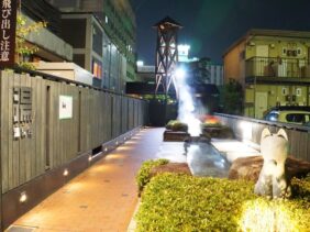 【温泉舎】(山口県の水汲み場)山口市湯田温泉4丁目 和風建屋と7.9mの櫓が目印 温泉が流れる「湯の川」や自然石利用の「飲泉場」有