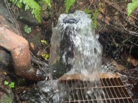 【犬来湧き水】(島根県の湧水)隠岐郡隠岐の島町犬来 密やかな林の中で湧き出る 豊富な噴水型水汲み場