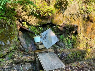 【ちせいの里及び蛍流公園の石清水】(愛知県の湧水)岡崎市茅原沢町茅生 日本酒造りに使われるという 住宅地の隣の沢に湧き出る石清水