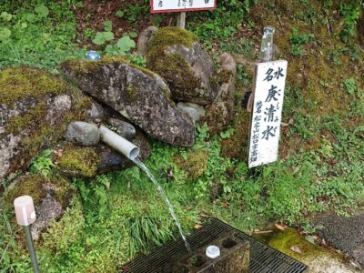 【庚清水】(新潟県の湧水)十日町市松之山松口 美しいブナ林「美人林」へと続く県道沿い 棚田を望む岩場から流れ出る清水