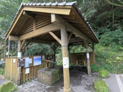 【たかたの命水】(鹿児島県の水汲み場)南九州市川辺町高田 高田石切場から湧き出る 東屋の下の整備された天然水取水場
