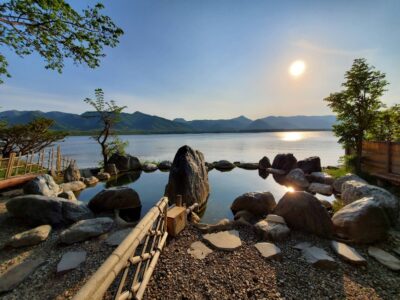 【コタン温泉露天風呂】(北海道の水場)川上郡弟子屈町屈斜路古丹 夕日が美しく映える 湖面すれすれに設置された無料露天風呂