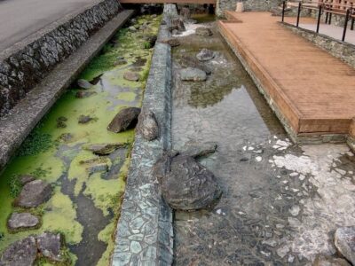 【寺町湧水広場】(徳島県の水場)美馬市美馬町願勝寺 寺院の立ち並ぶ閑静な場所 ウッドデッキや橋が整備された鑑賞水路