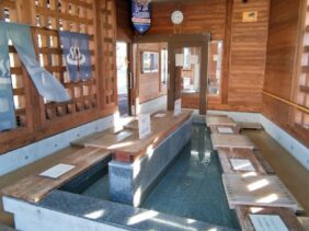 【駅前足湯ふろいで~】(徳島県の水場)鳴門市撫養町小桑島前浜 駅からすぐバス停横にある 簓子張りの木造建屋が美しい無料足湯