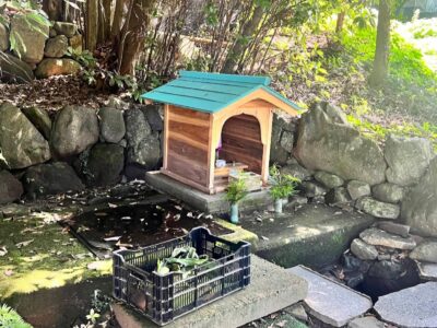 【中山の湧水】(香川県の湧水)小豆郡小豆島町中山 殿川ダム上流の伝法川沿い 小さな祠の前から湧き出る清水