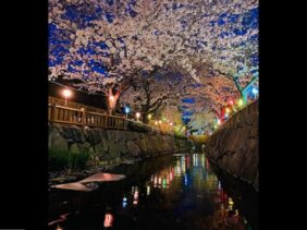 【鹿の井出水】(香川県の水辺)高松市太田下町 ライトアップされた夜桜も見事な 桜吹雪が舞う住宅街の石積みオアシス