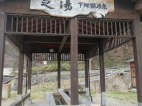 【朝日の湯】(宮城県の水場)柴田郡川崎町青根温泉 青根温泉街の外れにある 屋根付きウッドデッキの無料足場
