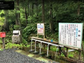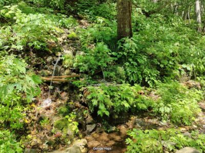 【升沢の甘露】(宮城県の湧水)黒川郡大和町吉田升沢 船形山登山口近く 許可が必要な林道の崖から湧き出る甘露水