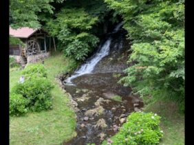 【親水公園お滝さん】(岩手県の水辺)北上市黒岩 水車小屋の横で なだらかな岩場を伝い落ちる滝がランドマークの親水公園