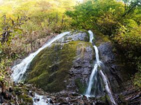 【女神霊泉】(岩手県の湧水)和賀郡西和賀町 ブナ林の名所・女神山の沢沿い 岩肌を伝って落ちる岩手の名水