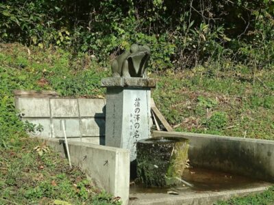 【蒲の澤の名水】(青森県の水汲み場)三戸郡三戸町泉山 樹海ライン脇の緑地で カエルの口から流れ落ちる沢水