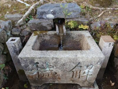 【峠の湧水】(京都府の湧水)京都市左京区大原小出石町 前ヶ畑峠近く 険しい峠道の脇で流れる湧き水