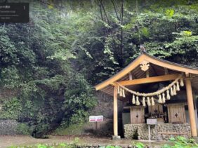 【胴腹滝】(山形県の湧水)飽海郡遊佐町吉出 安産の神が祀られ石仏が点在する杉林で 祠の両脇に流れる神秘的な滝