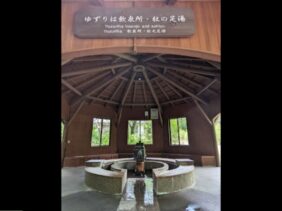 【ゆずりは飲泉所・社の足湯】(群馬県の水飲み場)吾妻郡中之条町四万 国民宿舎前の八角形の建物で広々ゆったり寛げる温浴・飲泉施設