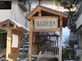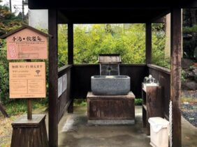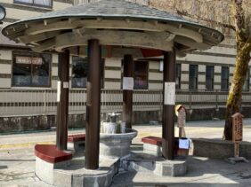 【塩之湯飲泉所】(群馬県の水飲み場)吾妻郡中之条町四万 木平商店街の真中にある 東屋風屋根・ひょうたん型つくばいの飲泉所