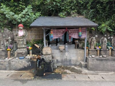 【湯谷温泉 温泉水汲場】(山口県の水汲み場)下関市吉田 小さな祠の仏様の前で湧き出る 万病の予防、美肌の維持に効く有難い温泉水