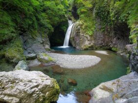 【大釜の滝】(徳島県の水辺・日本の滝百選)那賀郡那賀町沢谷 釜形の深い滝壺の底に大蛇が棲むという 落差20mの直瀑