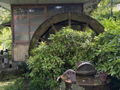【かじかの里公園水車】(佐賀県の水場)佐賀市富士町大字小副川 清流のほとりにたたずむ カジカガエルのモニュメントと水車小屋