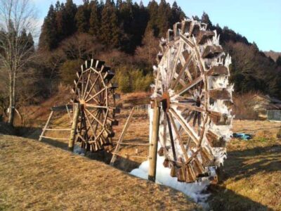 【凍りつく水車】(宮城県の水場)登米市東和町米谷相川 冬場には芸術的なつららを纏う 農家民宿近くの二連水車