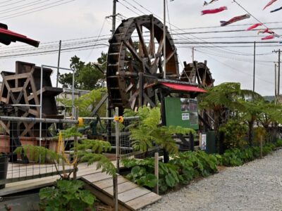 【ゴットン水車館】(福岡県の水場)八女郡広川町水原 ログハウスの傍らでゆっくり音を立てて回る 直径7mの米つき水車