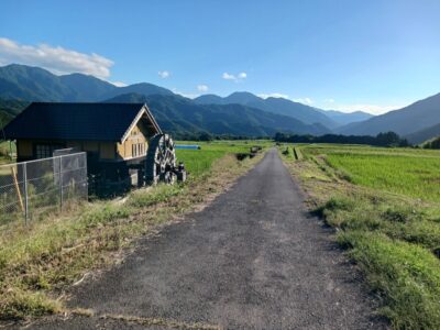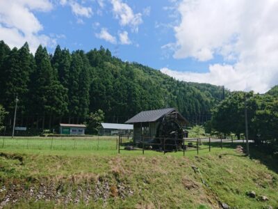 【貝田の水車小屋】(鳥取県の水場)日野郡江府町貝田 山々と田園が広がる長閑な道沿い 水力発電に利用される古民家風水車小屋