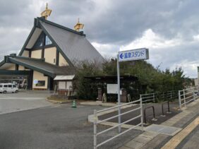 【越前 厨温泉スタンド】(福井県の水汲み場)丹生郡越前町厨 沈む夕日が美しい場所にある 道の駅の広い駐車場に佇む温泉スタンド