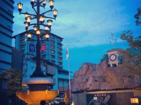 【湯元の広場】(石川県の水場)七尾市和倉町 ひときわ大きなガス灯が目印 飲泉所・温泉たまご施設がある憩いの広場