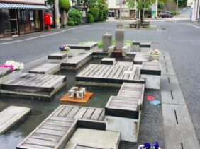 【山中温泉 笠の露】(石川県の水場)加賀市山中温泉湯の出町 慢性胆嚢炎、胆石症・便秘・肥満・糖尿病・痛風に飲んで効く 丸い屋根が目印の足湯・飲泉所