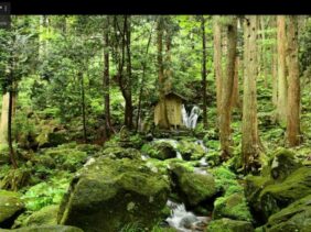 【胴腹滝】(山形県の湧水)飽海郡遊佐町吉出 安産の神が祀られ石仏が点在する杉林で 祠の両脇に流れる神秘的な滝