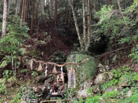【玉置龍神水】(和歌山県の湧水)新宮市熊野川町玉置口 巨大な磐座に目を奪われる 杉林の中の神秘的な空間にある湧き水
