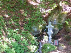 【菅谷大聖不動明王の水】(山形県の湧水)山形市大字門伝 県民の森の山際・不動尊の前にある 眼病に効くと伝わる清涼な水