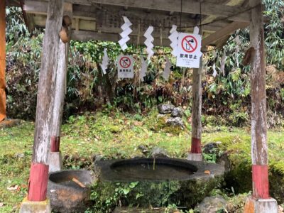 【熊野神社の手水舎】(山形県の湧水)山形市津金沢字熊の堂 境内にそびえ立つ樹齢千年の大杉近く 神社の手水舎に流れる湧水