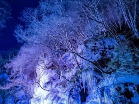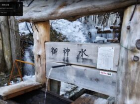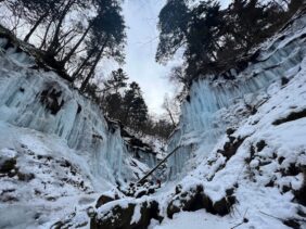 【氷瀑・湧水広場 八百万の命水】愛知県豊田市稲武町横川渡 巨大な山水の氷柱・氷瀑ができる公園にある 水量豊かで美味しい御神水