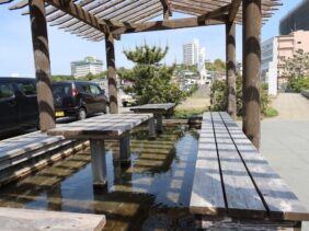 【桜島溶岩なぎさ公園足湯】(鹿児島県の水場)鹿児島市桜島横山町 日本最大級・全長100mの桜島・錦江湾展望足湯 バリアフリー設備有